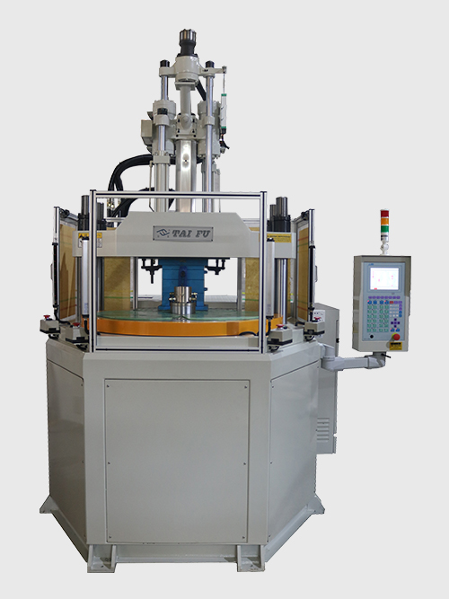 立式鎖模,立式射出,三工位(120度旋轉)圓盤注塑機。