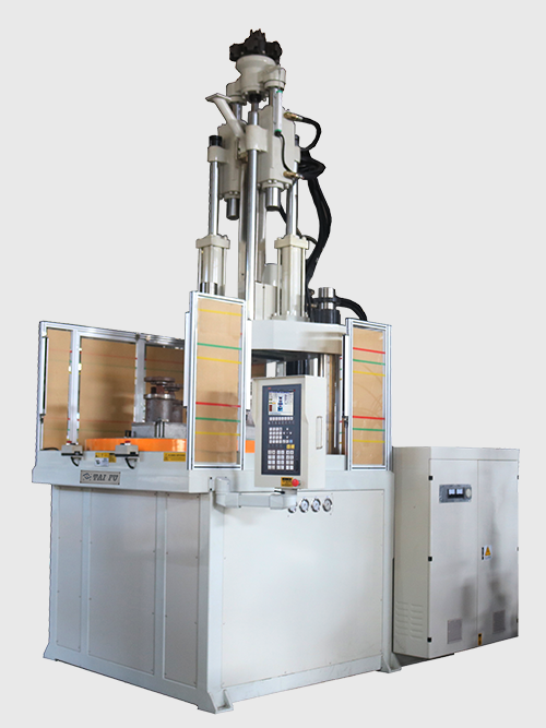 立式鎖模,立式射出,四工位(120度旋轉)圓盤注塑機。