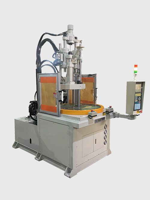 合模裝置采用了轉盤式結構,90度模具圍繞轉軸轉動使之達到上模具不停工作提高效率的目的,同時不停的轉動圓盤